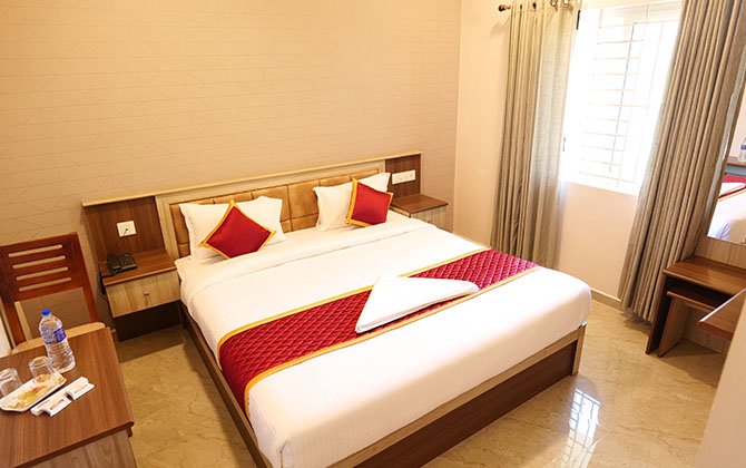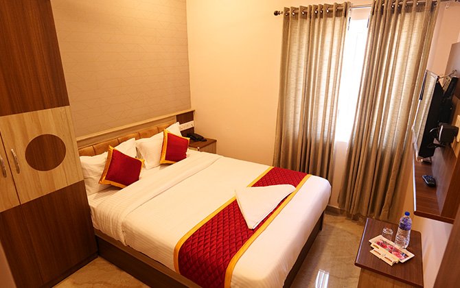 Deluxe Room has the following amenities like Water heater, Television, Air conditioning, Water bottle, Lift and Wi-Fi.